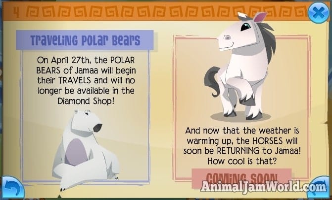 More animals will soon be coming and going to Jamaa. Polar bears will begin their travels on April 27th so get yours while you can. But if you miss out on a polar bear don’t worry because horses are coming back soon!