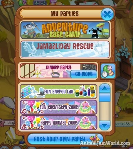 In order to access the Jamaaliday Rescue adventure, you have to click on the Parties button. It is located at the top of your screen. Once clicked, a list of adventures will appear. If you are ready for the Jamaaliday Rescue adventure, simply click on the adventure button to start it!