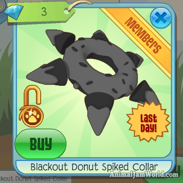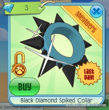 The three Spiked Collars above are all meant for land animals in Animal Jam. The Black Diamond Spiked Collar is meant for ocean animals, thus can only be worn by ocean animals. The collar is quite large, and is light-blue in color. The collar has eight large spikes, as well as smaller spikes in between those large spikes. All of the spikes are black in color. The Black Diamond Spiked Collar also has a shiny sparkles animation, which is meant to show the value of the diamonds.