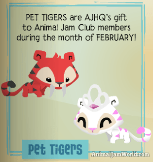 In the past, Animal Jam members used to receive monthly member gifts. The Pet Tiger is one of those gifts, rewarded as a monthly member gift during February 2013. It was later re-released into the game, sold at the Diamond Shop and Claws ‘N Paws, but has since been removed. Today, we are going to take a closer look at the Pet Tiger!